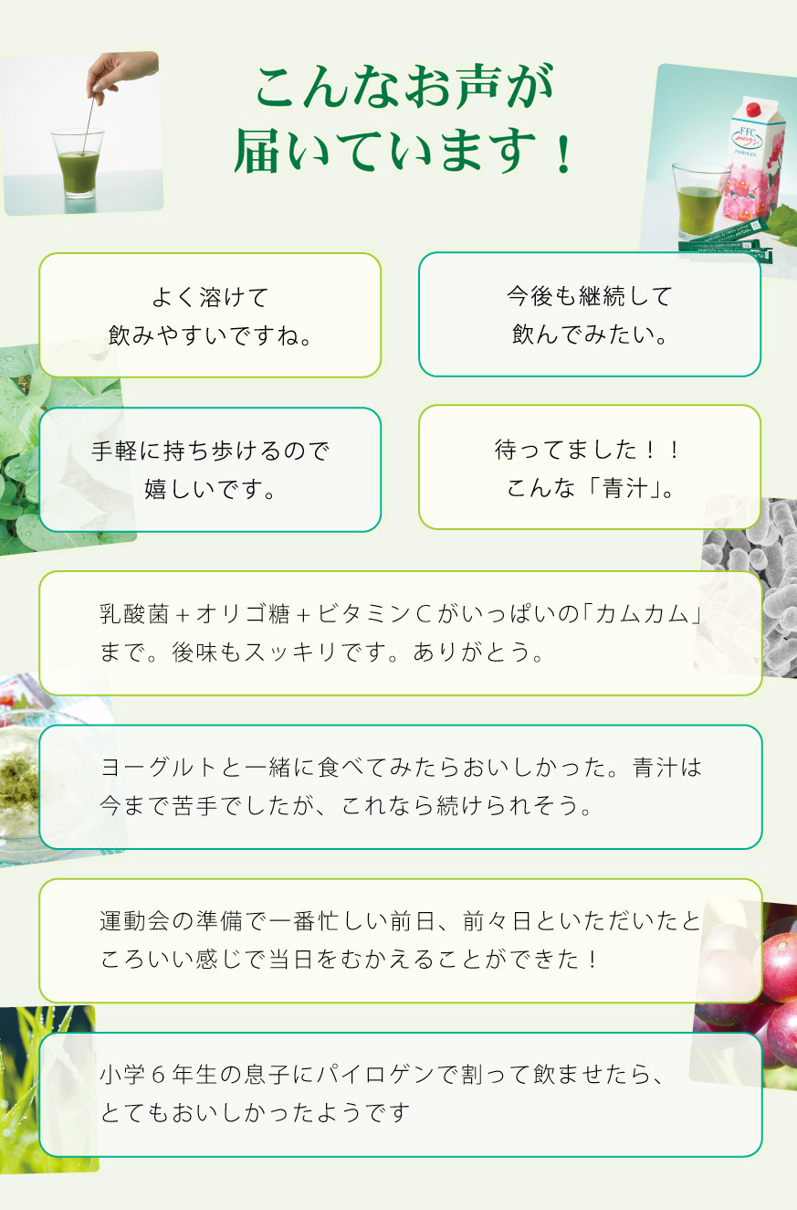 甘藷若葉末(国内製造)、大麦若葉末、澱粉、澱粉分解物、ラフィノース(ラフィノース、ショ糖)、フラクトオリゴ糖、カムカム果汁末、有胞子性乳酸菌、植物性乳酸菌