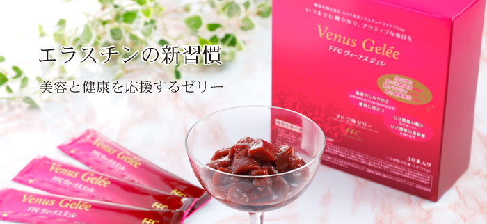 注目の美容成分「エラスチン」をはじめ美容と健康をサポートする厳選素材を配合。赤ワインにも使われるコンコード、カベルネ・ソーヴィニヨン果汁を使用し、ブドウの芳醇な味わいを寒天にギュっと濃縮しました。FFCヴィーナスジュレがあなたのはずむような毎日を応援します。